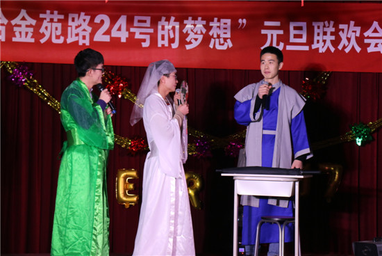 本次联欢会以“寄给金苑路24号的梦想”为主题,激情的演唱、火热的舞蹈、风趣的小品、精彩的乐器表演等各类节目轮番上演,让人眼花缭乱,现场气氛热烈,笑声不断。整场演出时尚与古典兼收,温情与火热并举,形式多样,节目精彩纷呈。此外,联欢会还穿插了互动游戏和抽奖环节。同学们在观看表演的同时还有机会参与抽奖,赢取精美的礼品。