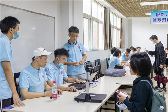 今年,学院还进一步发挥学科技术优势,推进智能化迎新工作。同学们在报到之前就可以在线提前完成选宿舍、申请绿色到校通行证等手续。在报到现场,学院自主开发的线上叫号系统实时显示各环节排队人数,实现核酸检测、学籍注册、入住宿舍人员分流,让迎新现场更加有条不紊。“刷脸”报到系统,加强了新生身份验证的准确性,更加快捷。智能化的系统串起了学籍信息、报到流程、住宿安排以及缴费管理等环节,推动了报到的顺利完成。
